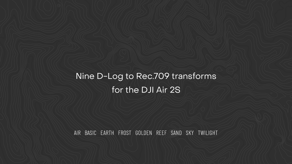 Nine (9) custom built LUTs for the DJI Air 2S. Each 3D CUBE LUT transforms D-Log M footage to the standard Rec.709 color space. Package includes matching XMP profiles for color grading still images in Adobe Camera RAW, Lightroom Classic and Lightroom CC.